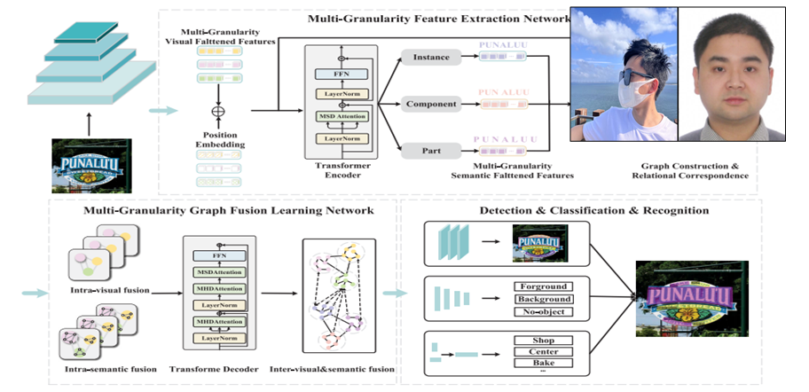 Since November 2023, research has been conducted on scene text detection and recognition methods based on a multimodal framework. To address the issue that current multimodal approaches typically use a single-granularity feature fusion strategy, which fails to fully leverage prior contextual information, a Multi-Granularity Visual Semantic Interactive Fusion Network (MGN-Net) has been proposed. This network includes: (1) a Visual Semantic Multi-Granularity Feature Extraction Network (VSMN); and (2) a Multi-Granularity Graph Fusion Learning Network (MGFN).